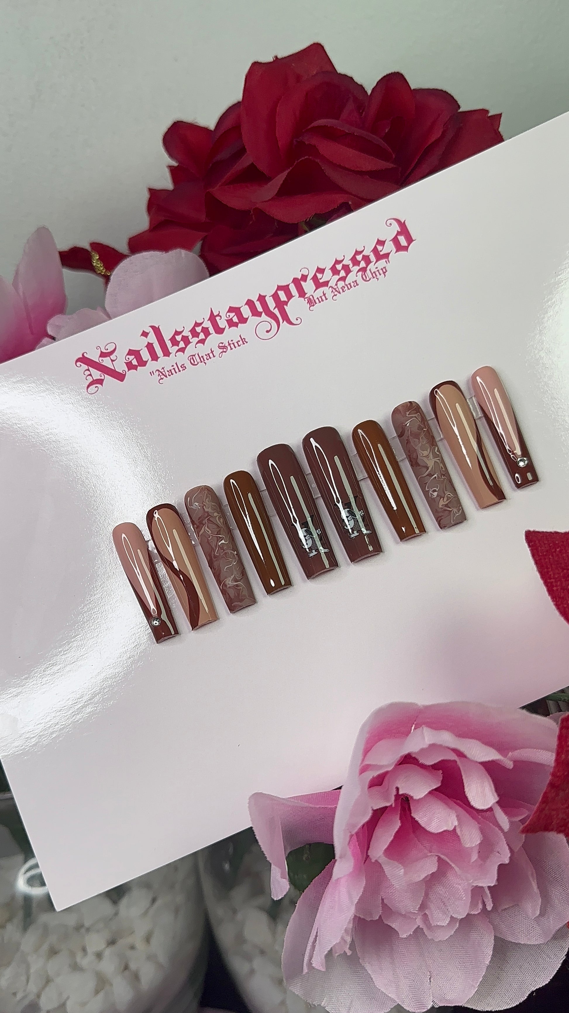 - Nail Length & Shape: These gorgeous chocolate drizzle brown marble press on nails are very long and have a 2XL square shape to provide an elegant look to your hands.